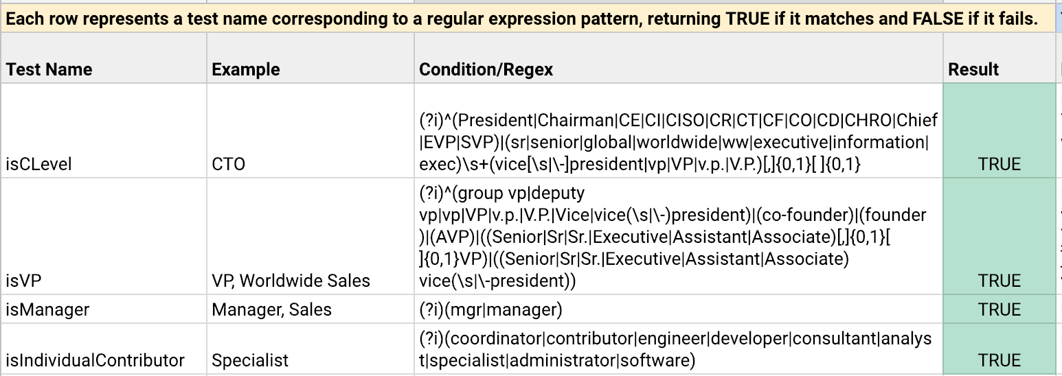 2. We use the header column to look up the row of the test we want to execute. For isManager level, we would use a formula to look at the column labeled Test Name in the other tab, do a vLookup to find the row matching isManager, then read the expression in the Condition/Regex column, and return a TRUE/FALSE result using the REGEXMATCH formula, e.g. =REGEXMATCH(“Sr Manager of Spreadsheets”,”(?i)(mgr|manager)”)