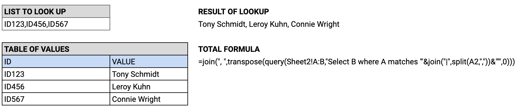 Each item in the list is the key you want to lookup in another list. One way to do this in multiple steps is to use VLOOKUP where you would run a vlookup to get a different value, e.g. to find that ID123 has the student name “Tony Schmidt”.