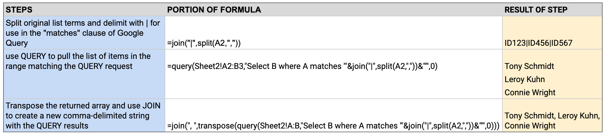 First, get the list items from our original list into a format that QUERY understands. The QUERY function in Google Sheets uses the term “matches” to look up one or more terms in the QUERY action. Using the the SPLIT function, we find each item in the comma-delimited list and then JOIN to replace commas with a “|” character, indicating item 1 OR item 2 so that the QUERY uses multiple terms to match.