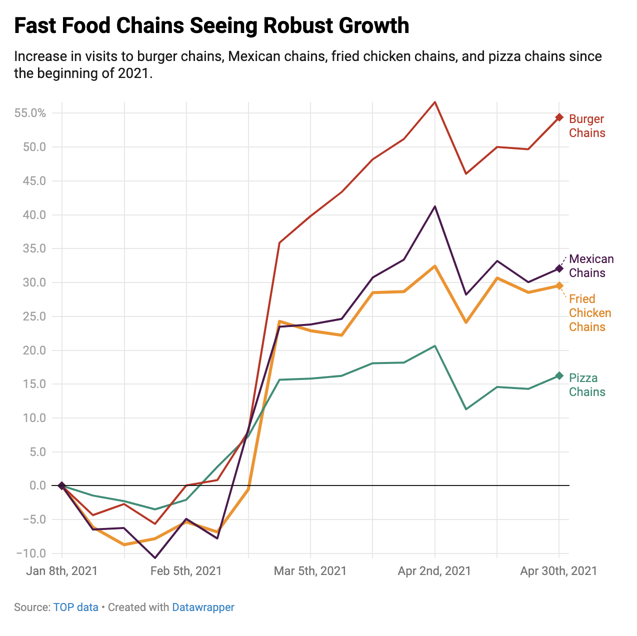 We know that fast casual chain restaurants are something that people visit in the US regardless of income. If people are going out to eat more often as the COVID19 Pandemic continues, and if they are choosing to do so at fast casual restaurants, we should expect to see more demand. Here’s one indicator of fast food chain visits changing in early 2021.