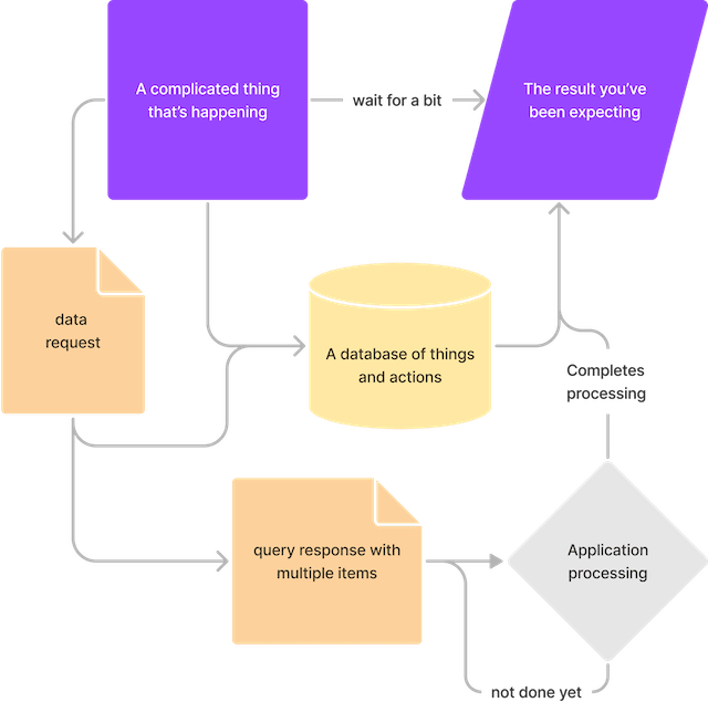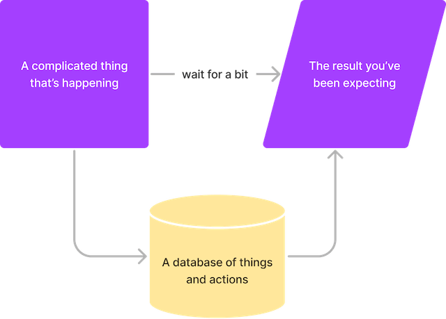 Here’s a (very oversimplified) example of what the prospect expects to see when discussing a process. Some stuff happens, you wait a bit, and then you get the result you expected. They don’t need to know why it’s happening, but to internalize the outcome of what happened. You may add some details to provide a jumping-off point, but it’s likely that you know a lot more about the internals of the problem than they do.