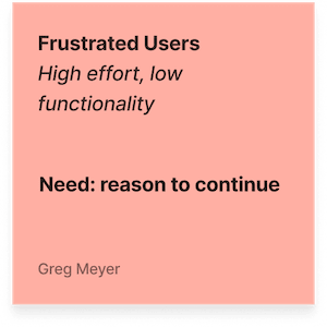 They are reacting to a combination of high effort – higher than they expected, at least – and low functionality. Whether they arrived by accident or expected the software to work differently, frustrated users present a problem both because they will tell other people about their negative experience and because they will not get what they want from the process.