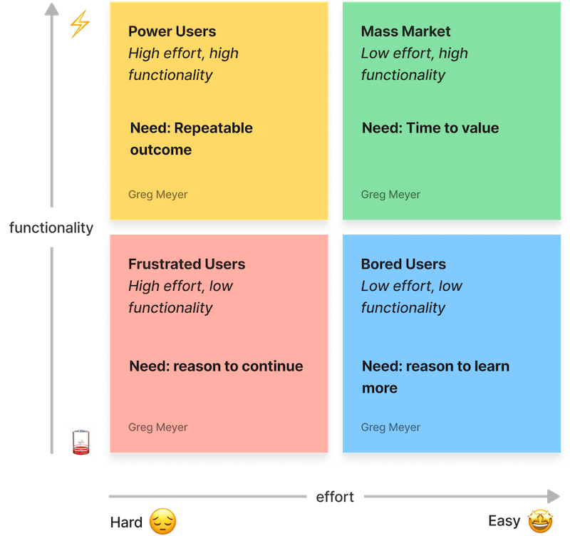 Power users are your best friend and a potential pitfall. Because they are smart and can extrapolate quickly to solve their problem, they will find a way to use your product in a way that works for them. Why is this great? You’ll get good feedback on what you’re doing. Why is this bad? Very few power users represent the mass market user you are trying to reach. They have a high tolerance for putting in a lot of effort to reach their desired outcome.