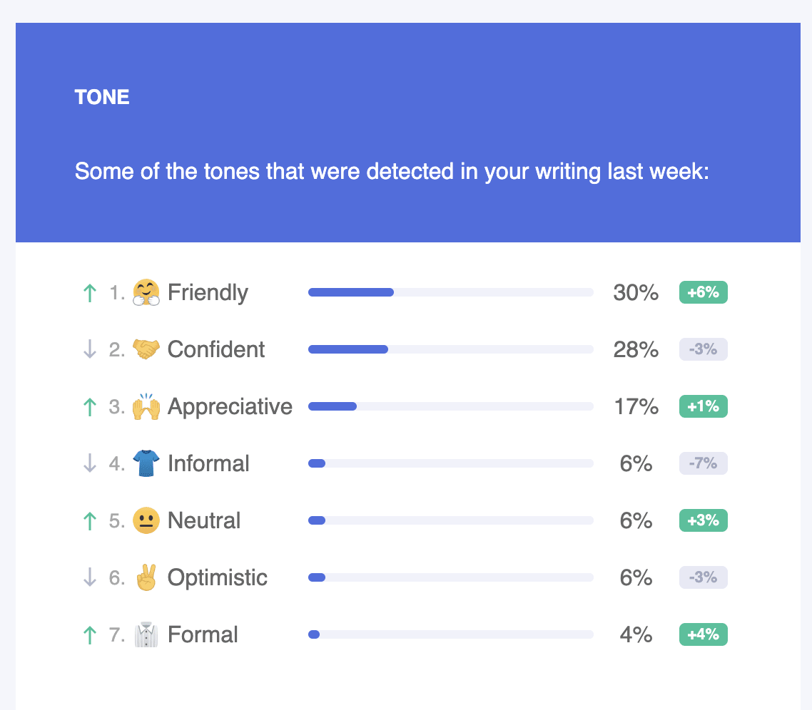 Rollup stats and trends can also provide context for users to watch their performance over time. Aggregate trending is a good pattern to engage more active users and will help keep them engaged, as in this snippet from a Grammarly notification email.