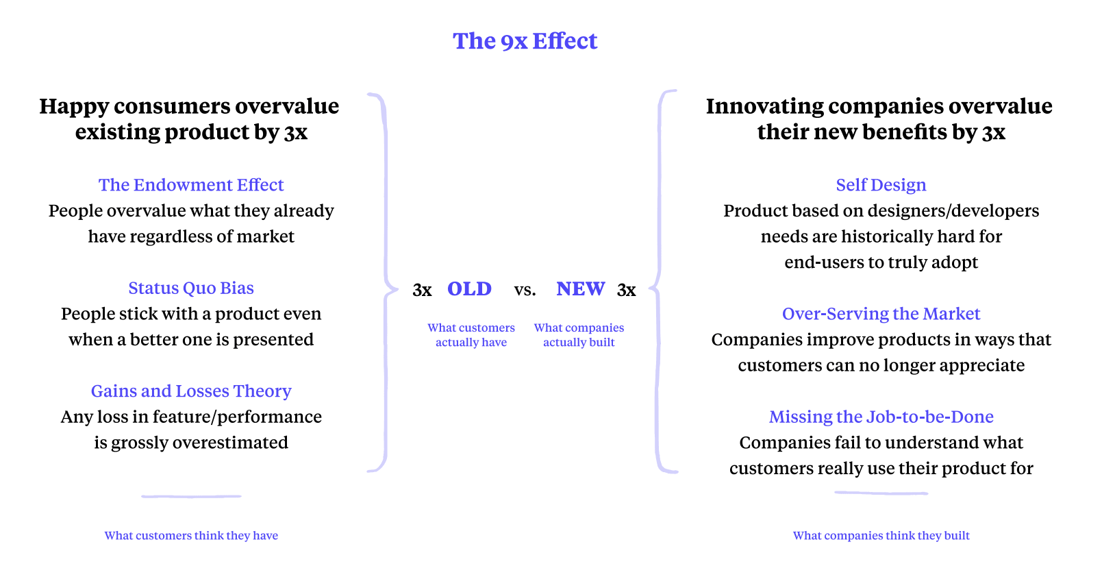 People overweight the benefits of the solution they have. Innovators overweight the value of their solution. Multiplying these factors gives you a need to produce a really big change to nullify these effects. Gourville’s “Eager Buyers, Stony Sellers” explains it this way: