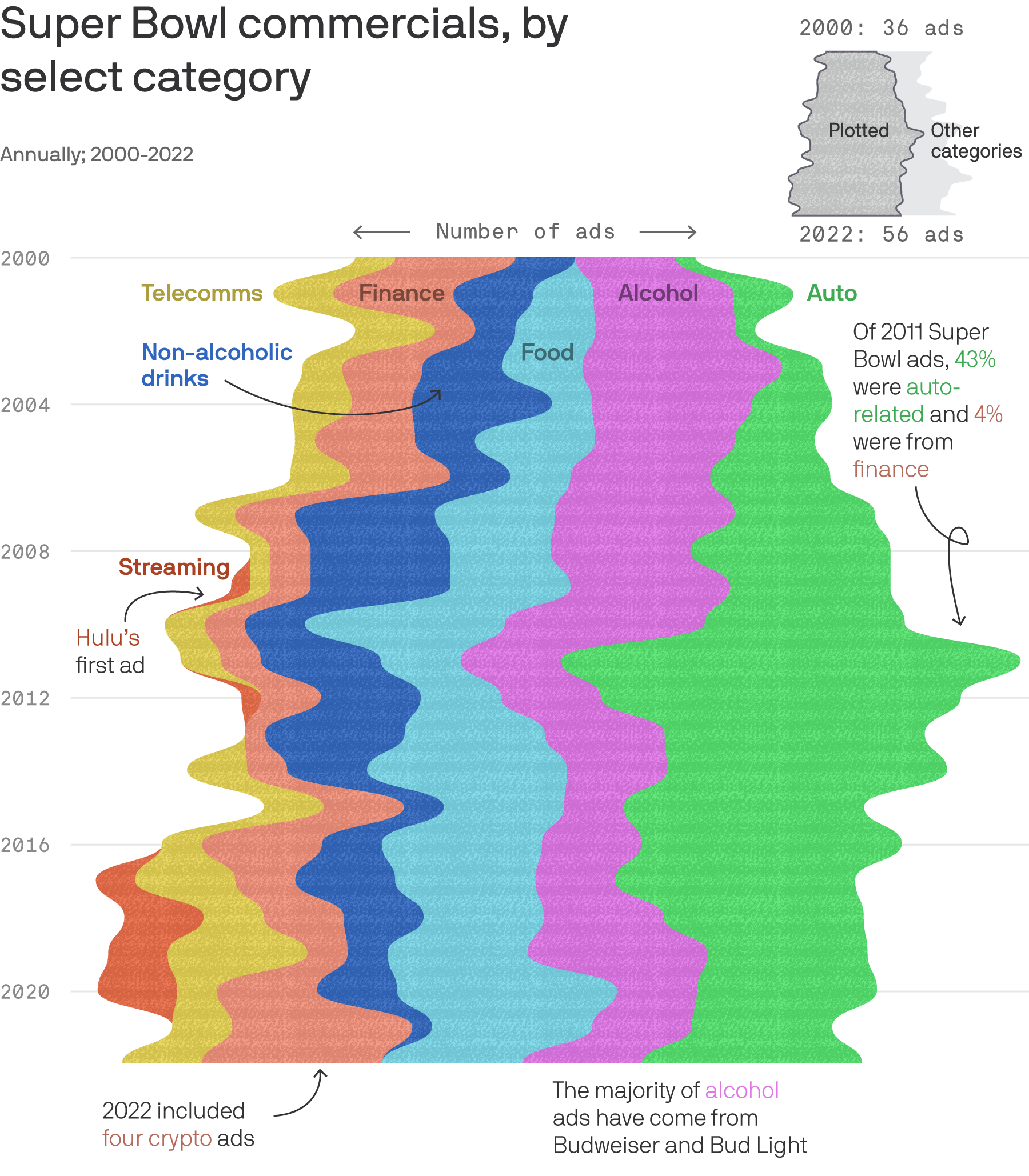 Here’s a sampling of ads from 2000-2022. Most of these focus on either big ticket items (cars, finance) or frequent purchase consumables (food, alcohol)