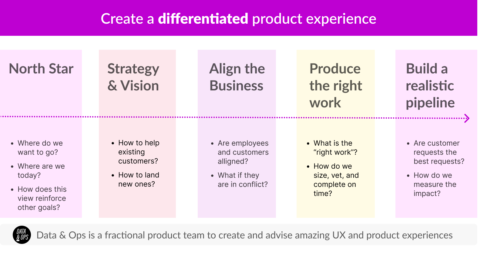 The second pillar in our differentiated product experience is the goal to maintain strategy and vision in the product work that we do. Vision informs the ultimate goal and helps us to know where we are going while using the North Star as a guide. Strategy is the process of aligning our tactics to produce outcomes that align with the vision.