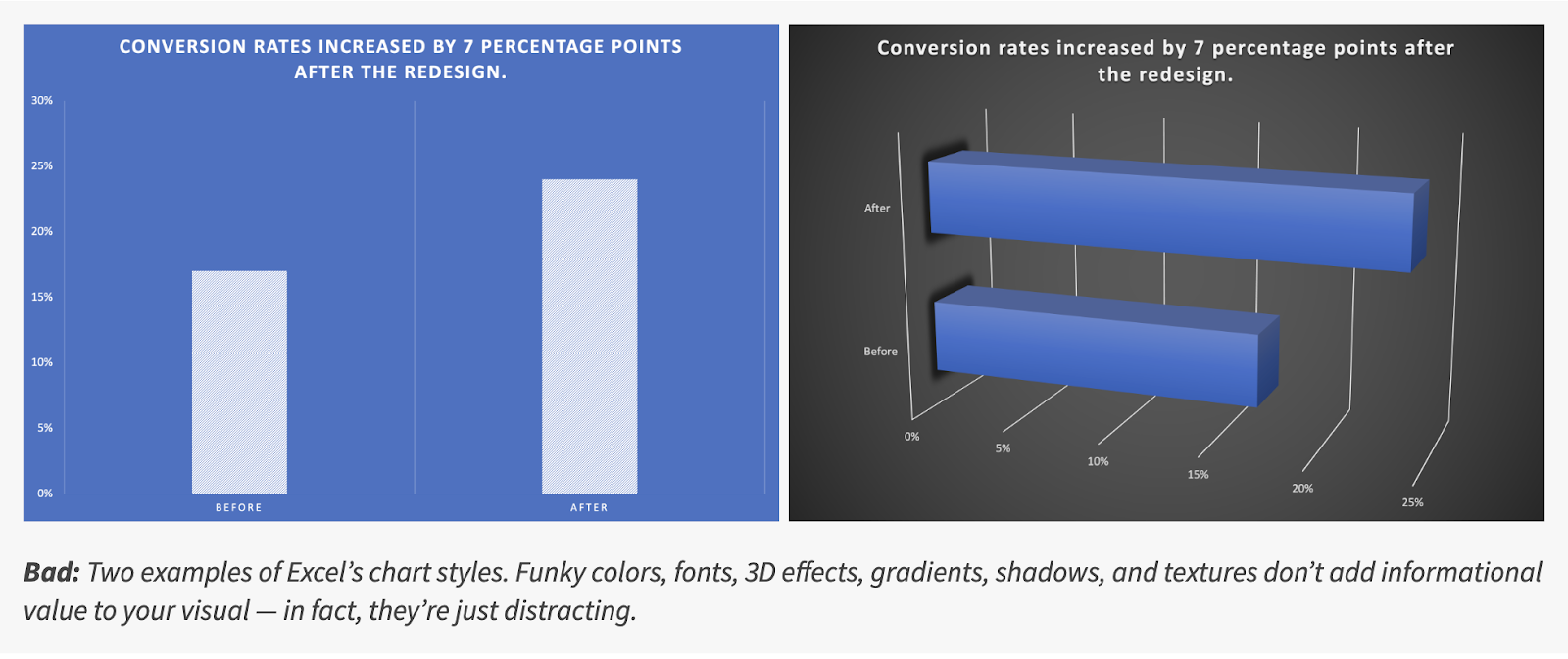 Matching the headline idea to the visual and limiting the elements where you want people to focus increases the chance they will get the insight and be able to apply it elsewhere.