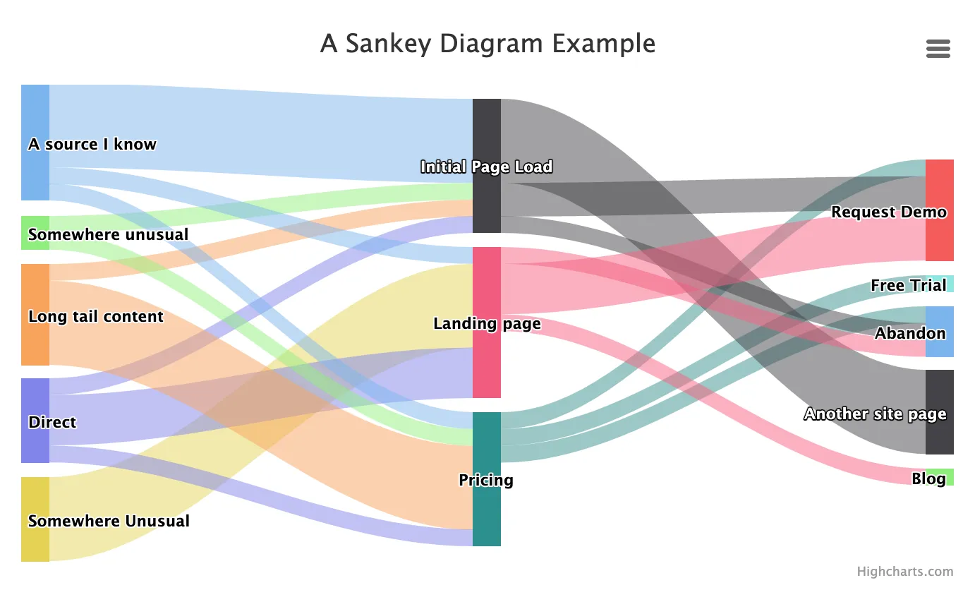 A Sankey diagram is a more exotic type of visualization that show data progression through multiple stages to multiple endpoints, as in multiple attribution scenarios.