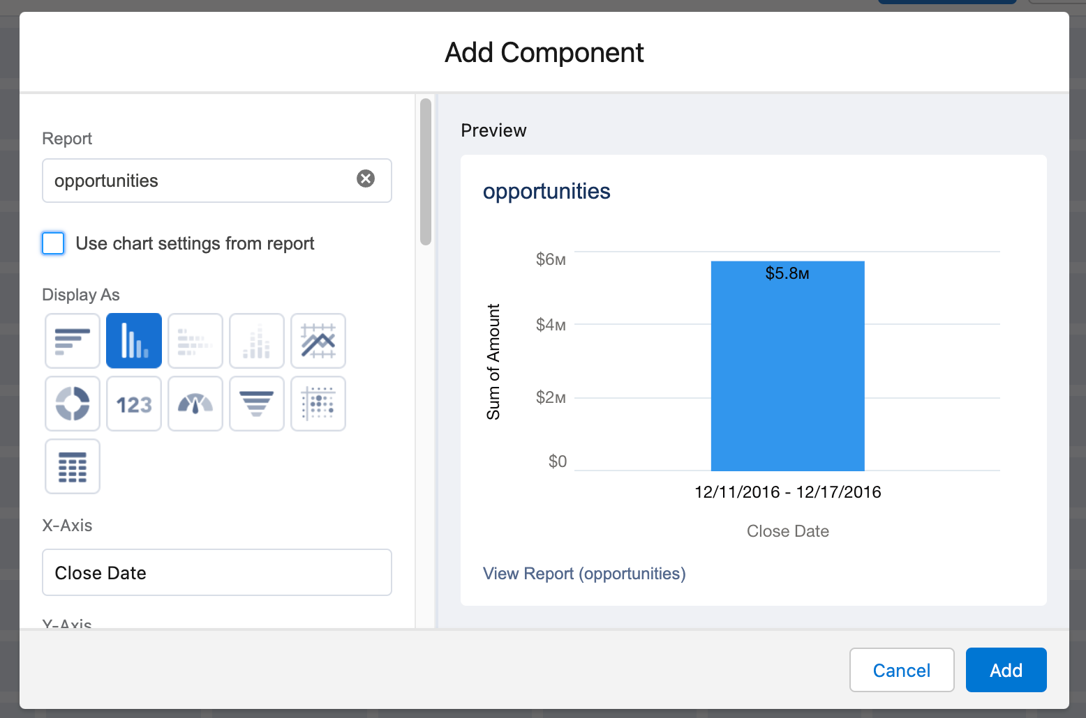 That’s ok. You’re smart. You know that you can create a more sophisticated version of this report in a Dashboard. It even has a currency indicator to show you the amount of your opportunity report that you created previously.