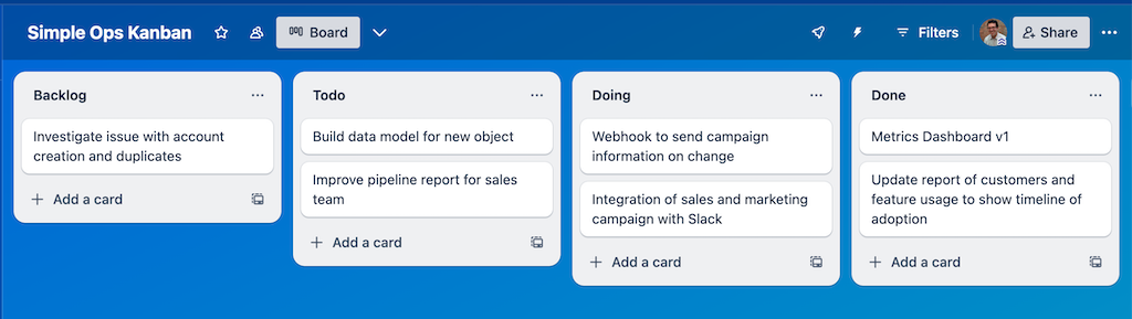 In an Ops Kanban board, details are everything. But each card doesn’t need to be a full-blown customer story or Product Requirements document. Cards need to have enough information to work on and should be more detailed as they get to the Doing stage.