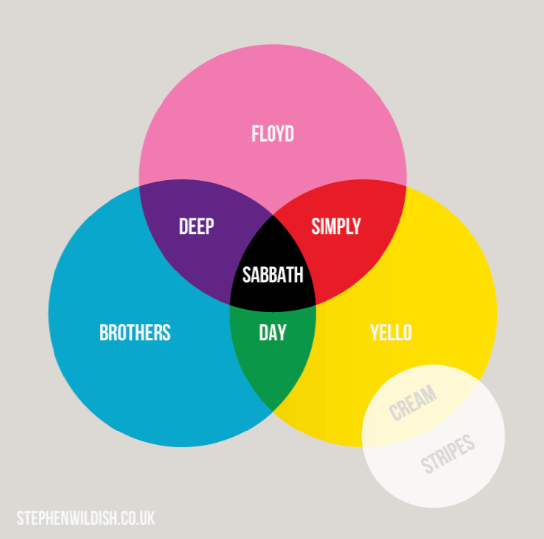 2. At the intersections, produces an unexpected commonality. In popular venns like the Bands and Colors above, the blending of colors into other colors is echoed in the call outs, but the attributes don’t necessarily extend into “similar musical styles” or other common attributes.