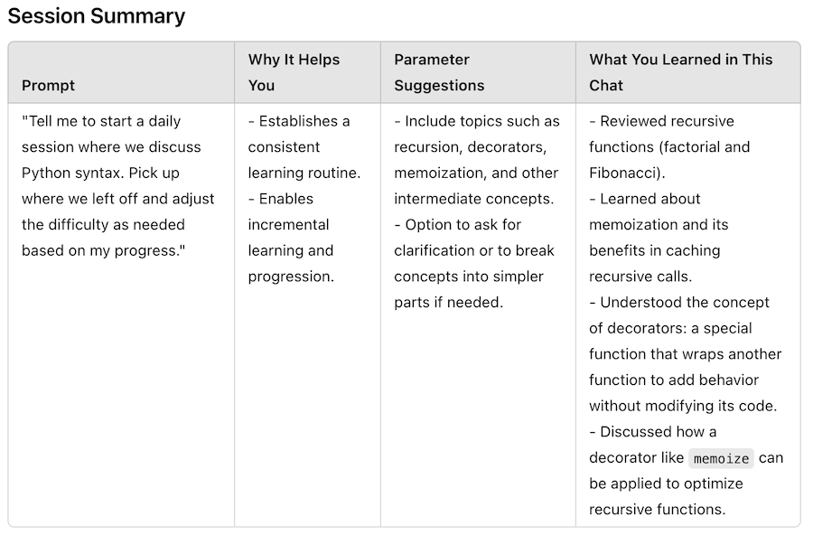 To customize the bot, I’ve created an instruction summarizing the topics we’ve covered that day that gets printed as a table at the end of the chat. I also asked ChatGPT to remember the topics we’ve covered so that I don’t get the same questions every day.