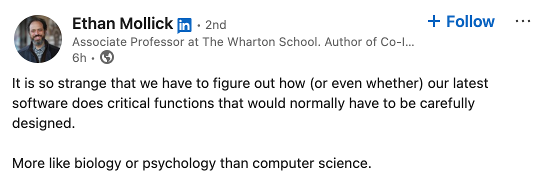 For example, LLMs do not “know” whether a task is “completed” or “not” unless we give the model a rule that results in a true statement of “completed” or “not completed.” Ethan Mollick, a professor at the University of Pennsylvania, compares this to observing a biological process, not a software one.