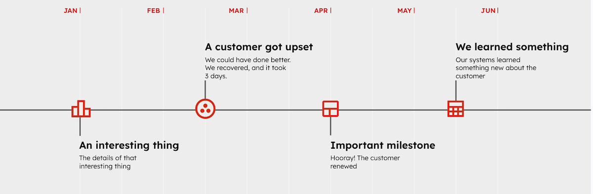 Imagine that you are in a typical SaaS business, and you go to look at a customer’s sales history in your CRM. Whether Salesforce, Hubspot, or another system, you depend on an external process or automation to place tasks in the timeline to represent changes in that customer’s history or sentiment.