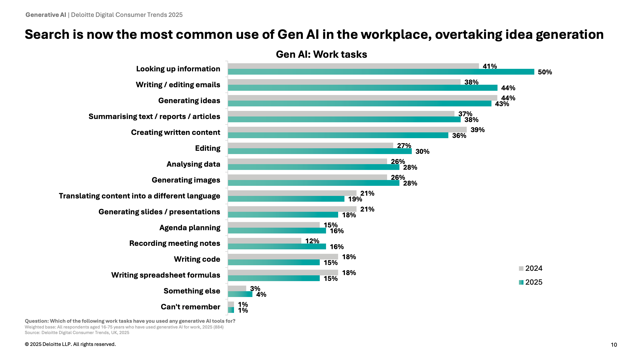 The most prevalent AI tasks in this Deloitte study are looking up information, writing emails, or generating ideas. We are treating AI as a tool to get quick answers rather than a partner for collaborative thinking.