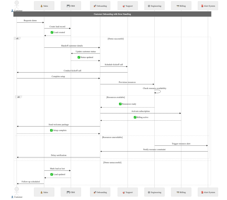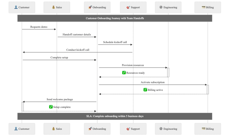 Consider this scenario: Your customer success team reports that onboarding is taking too long. With a sequence diagram, you can immediately see that the bottleneck is in the resource provisioning step. Maybe engineering is overwhelmed, or maybe the provisioning process is too complex.