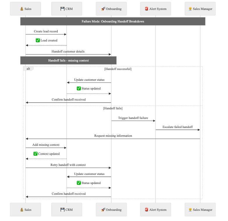 Now let’s drill into one specific “known process” from the journey—the onboarding handoff failure. This sub-diagram shows exactly what happens when the handoff between sales and onboarding breaks: