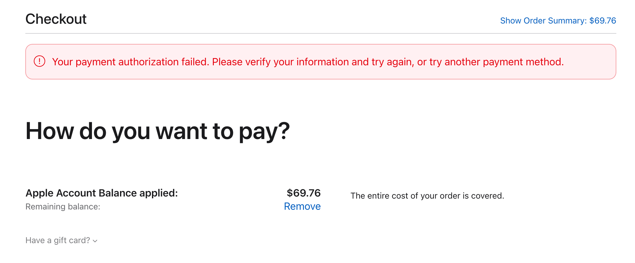 Yet something seems broken in their ecosystem when you try to purchase goods and services from them using their “Apple Account credit” – a way to store gift card value and redeem it for digital or physical purchases.