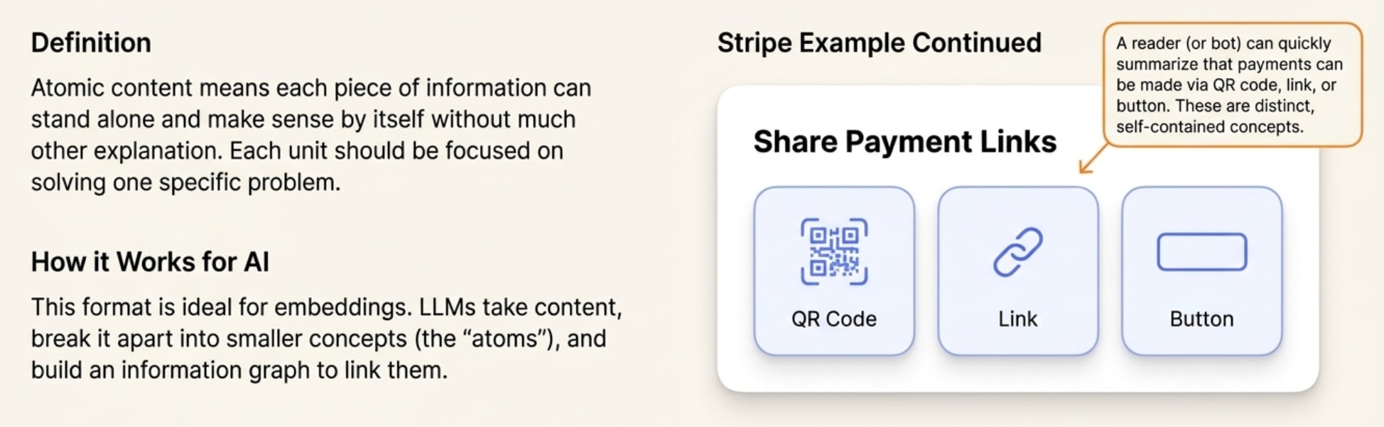 The concept of “atomic” content means that when you write something for LLMs in a Help Center, you need that content to stand alone as an example that makes sense by itself without much other explanation.