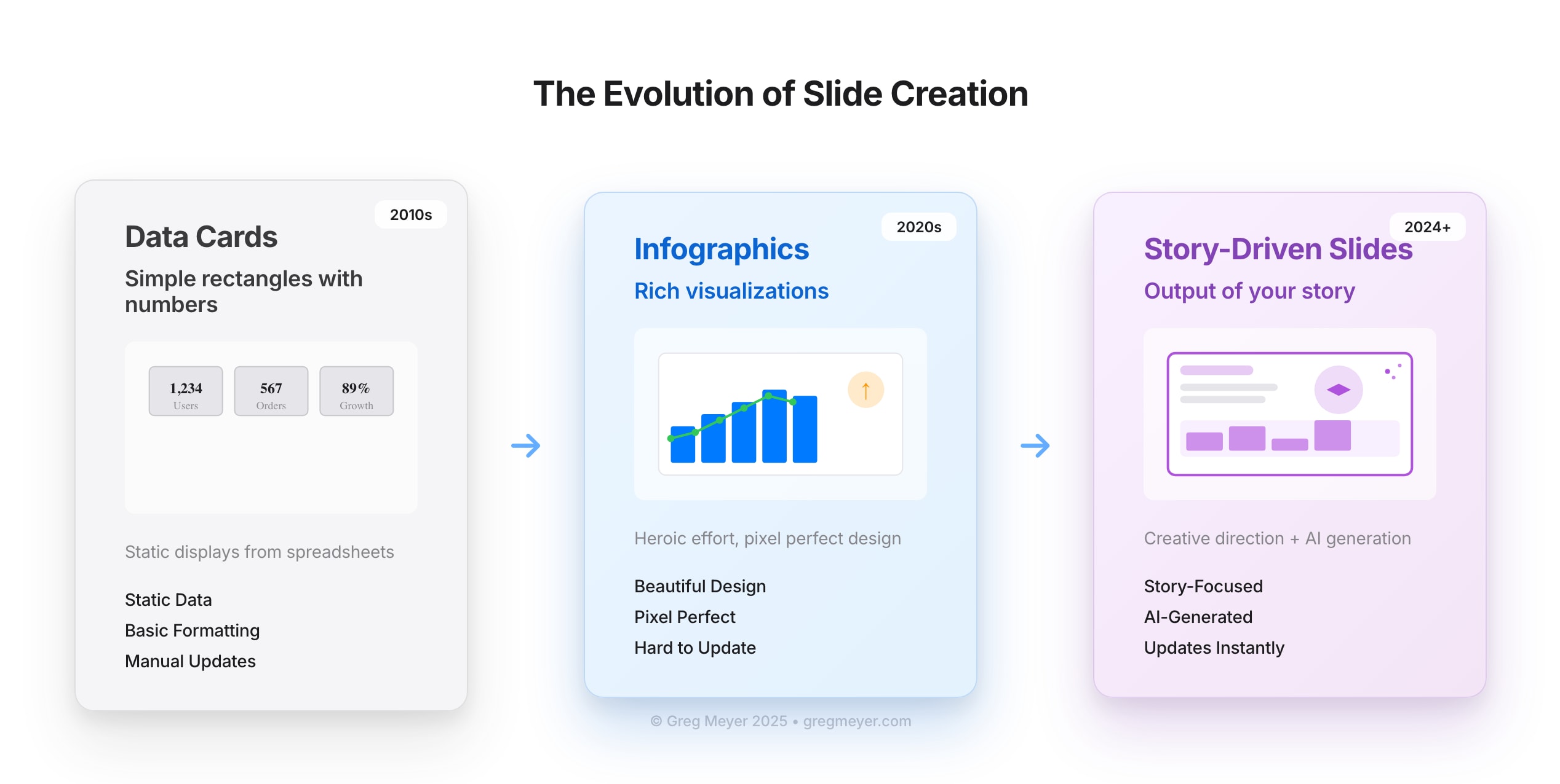 What if the real innovation of data driven stories (or infographics) created by generative AI lets us relax from the idea of a pixel-perfect slide?