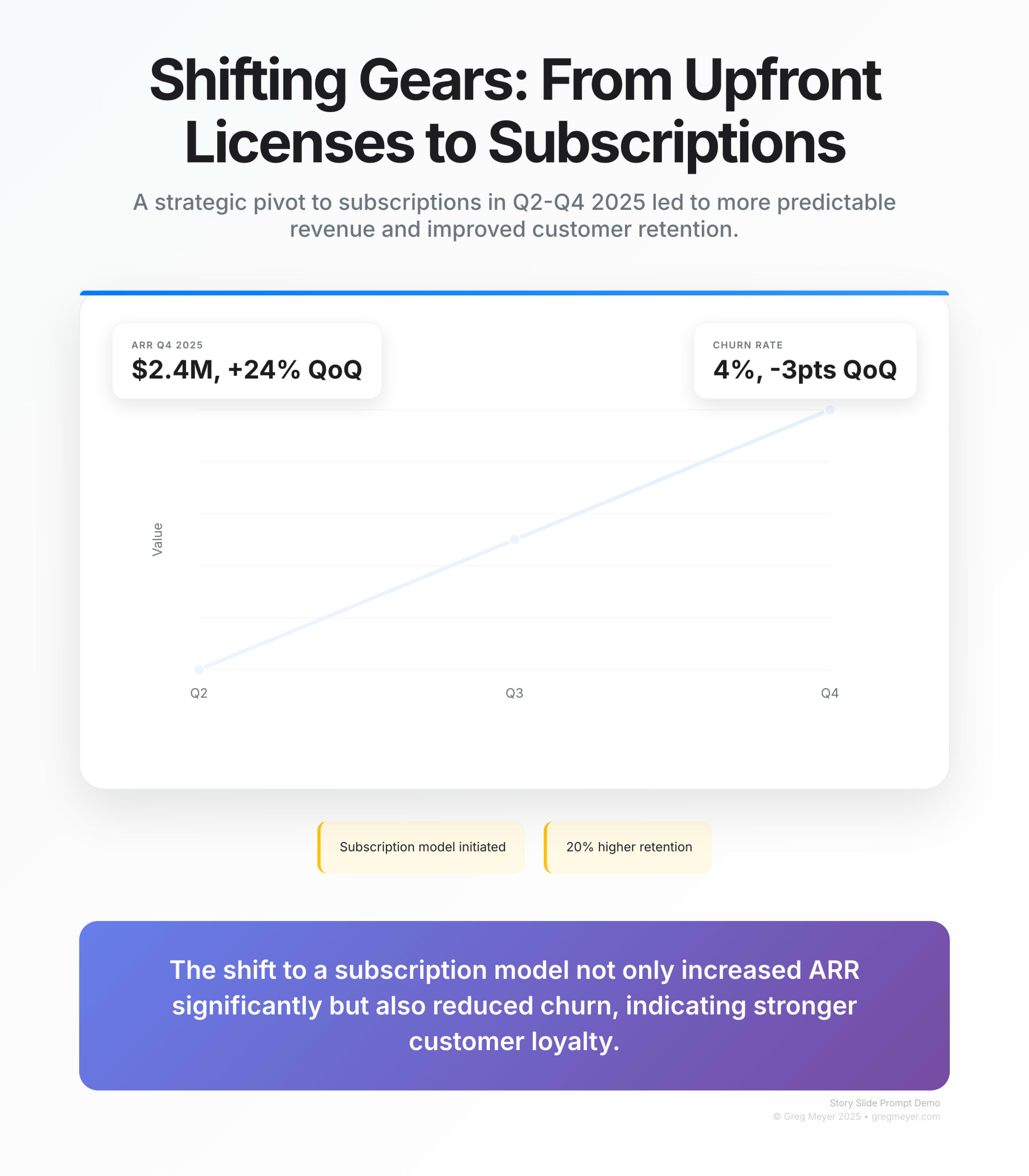 You are the Modern Graphics Generator. Render a story-slide using the modern palette. What changed: Revenue model shifted from upfront licenses to subscriptions Time period: Q2-Q4 2025 What it means: Predictable revenue and 20% higher retention Call to action: Double down on usage-based tiers Include metric callouts for ARR ($2.4M, +24% QoQ) and churn (4%, -3pts QoQ). Return the image and a one-sentence alt text.Drop that into the agent, and you get back a slide with a bold title, the modern gradient background, two stat cards, and a CTA footer, with no timeline spent nudging boxes in Figma.
