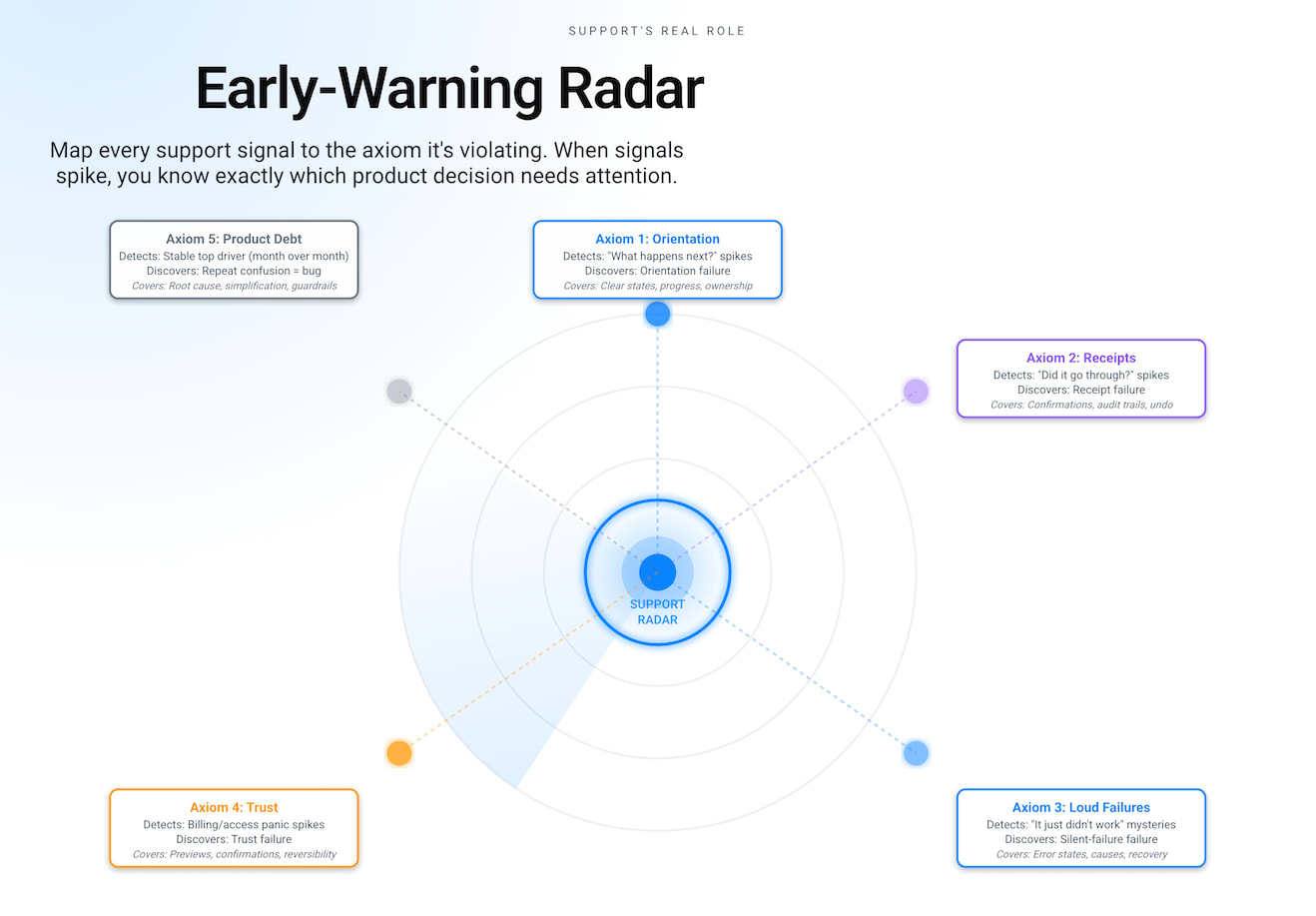 Tickets, chat logs, re-opens, and “any update?” pings are radar returns. These are weak signals that something upstream is getting unstable. The product team won’t see it in the roadmap. Sales won’t see it until deals slow down. Leadership won’t see it until it’s counted and shows up in a report.