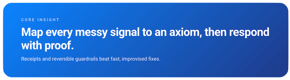 Values are identity. Axioms are operating constraints. Your customers don’t churn because your values are unclear. They churn because outcomes are unpredictable.