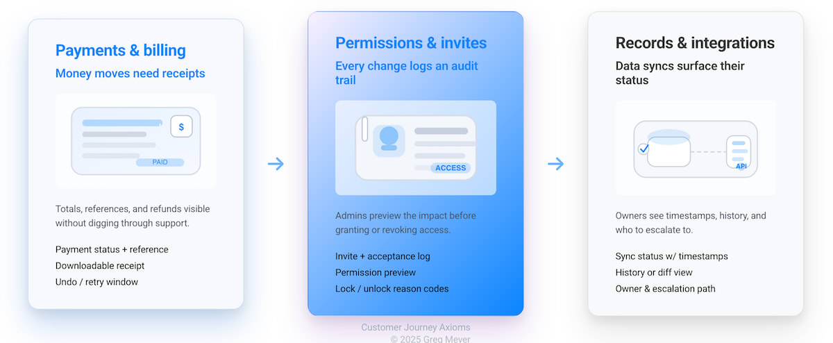 Forces in the product: previews, confirmations before irreversible actions, clear permissions language, transparent billing changes, reversible flows where possible.
