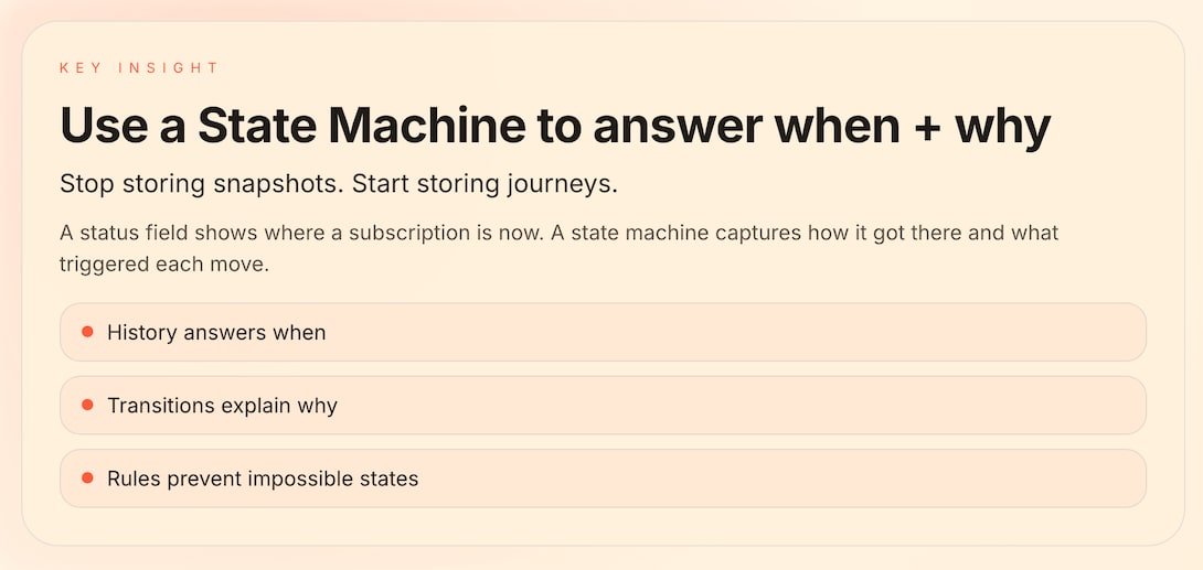 What’s the takeaway? Don’t add more fields. Change the model instead. Remember that status fields capture moments, and state machines capture journeys. For time-series events like subscriptions, you need the journey.