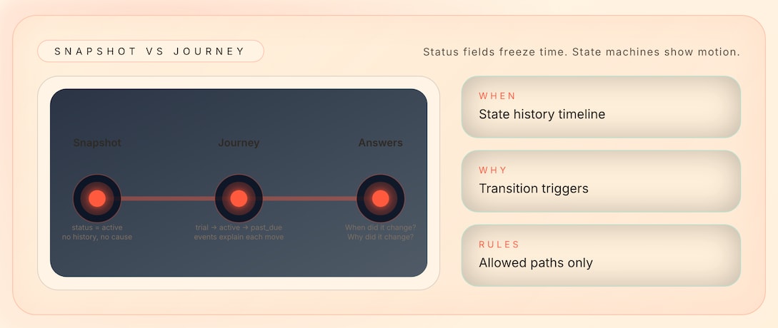 A state machine isn’t just a better way to store status. It’s a different way to think about data. Instead of asking “what is the current state?” you ask “what is the journey?” The shift from snapshot to story unlocks better questions that actually matter.