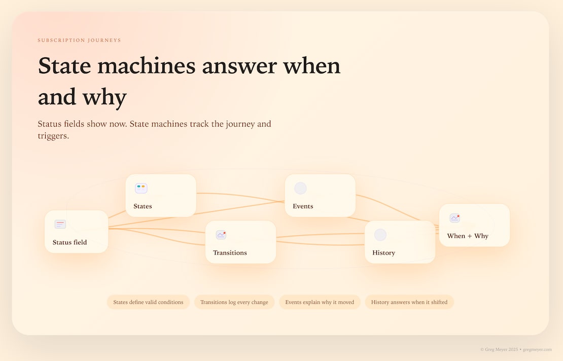 A status field answers “what.” A state machine answers “when” and “why.” For subscription lifecycles, that’s the difference between a snapshot and a story.