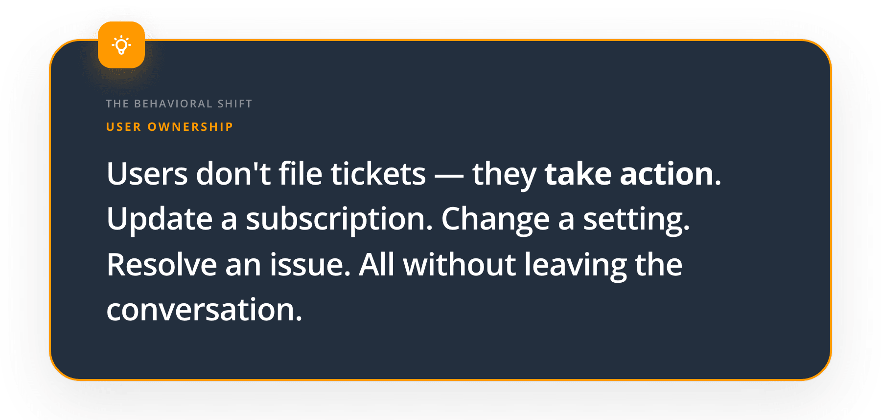 A user asks a question. The system responds, but also offers two actions inline. One click resolves the issue. No ticket number. No queue. No escalation. The conversation continues.
