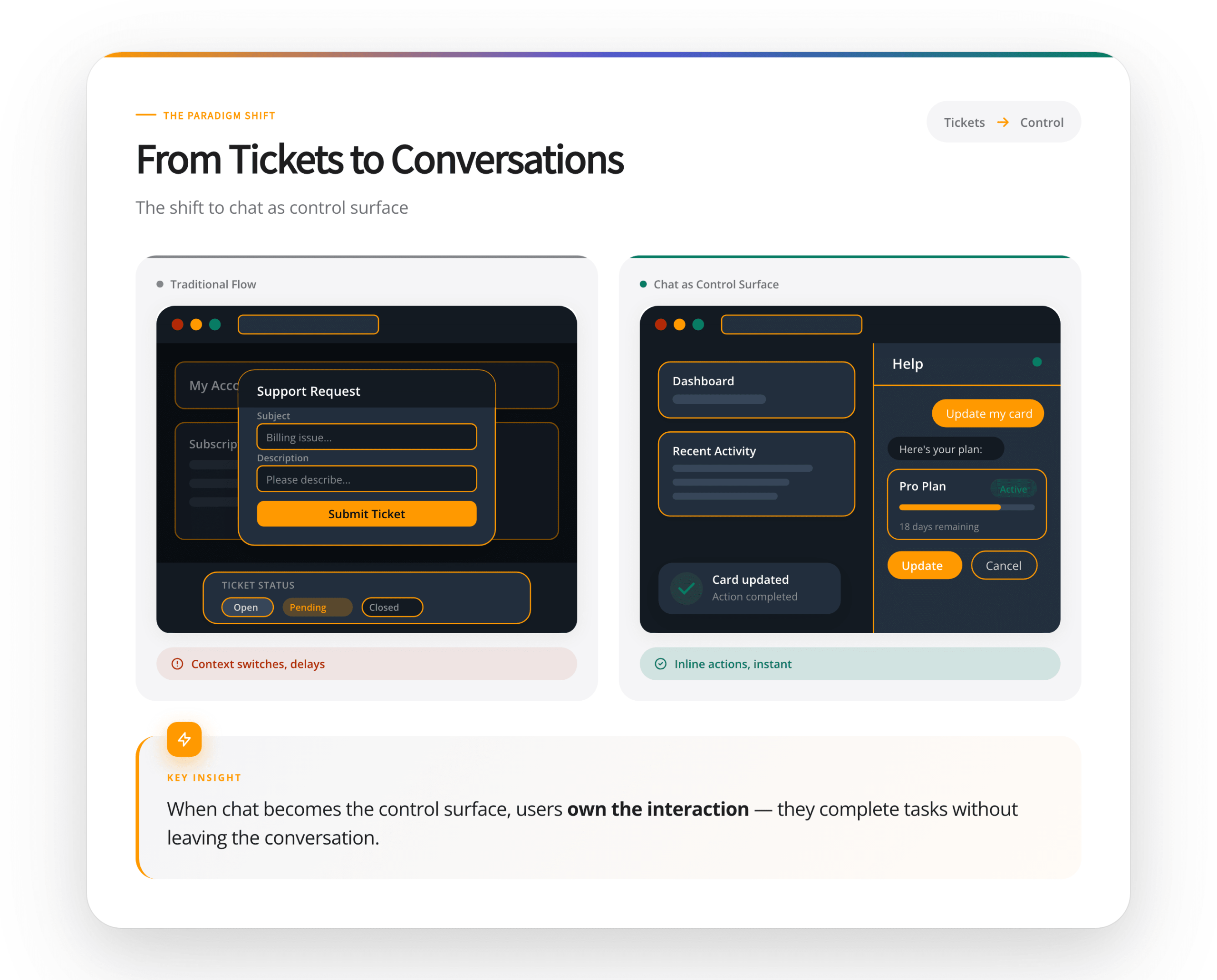 By “control surface,” I don’t mean that chat should replace every interface. I mean a surface where intent can be clarified and action can be taken without forcing the user to leave context.