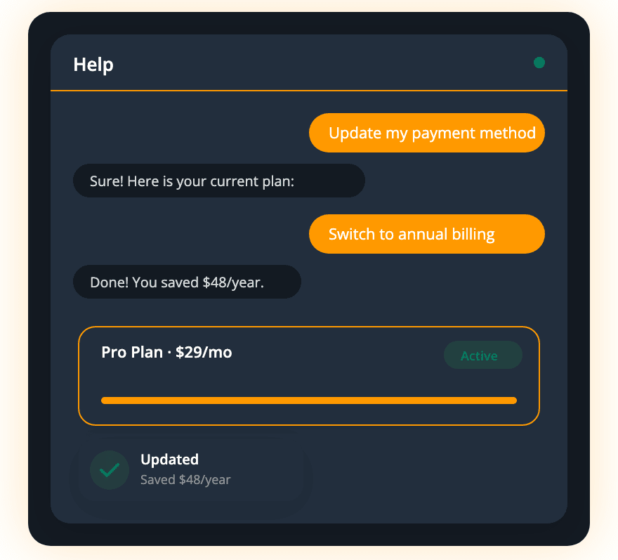 Modern chat can persist context, render UI, surface options, preview outcomes, and trigger workflows inline. Once conversations can stay stateful and take action without handoffs, chat stops being a fallback channel and becomes a legitimate interface.