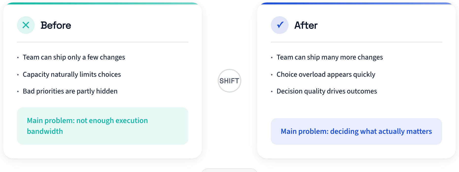 If your team can generate ten viable changes by noon, the problem is no longer “Can we build this?” It is “Can we choose well enough to avoid compounding noise?”