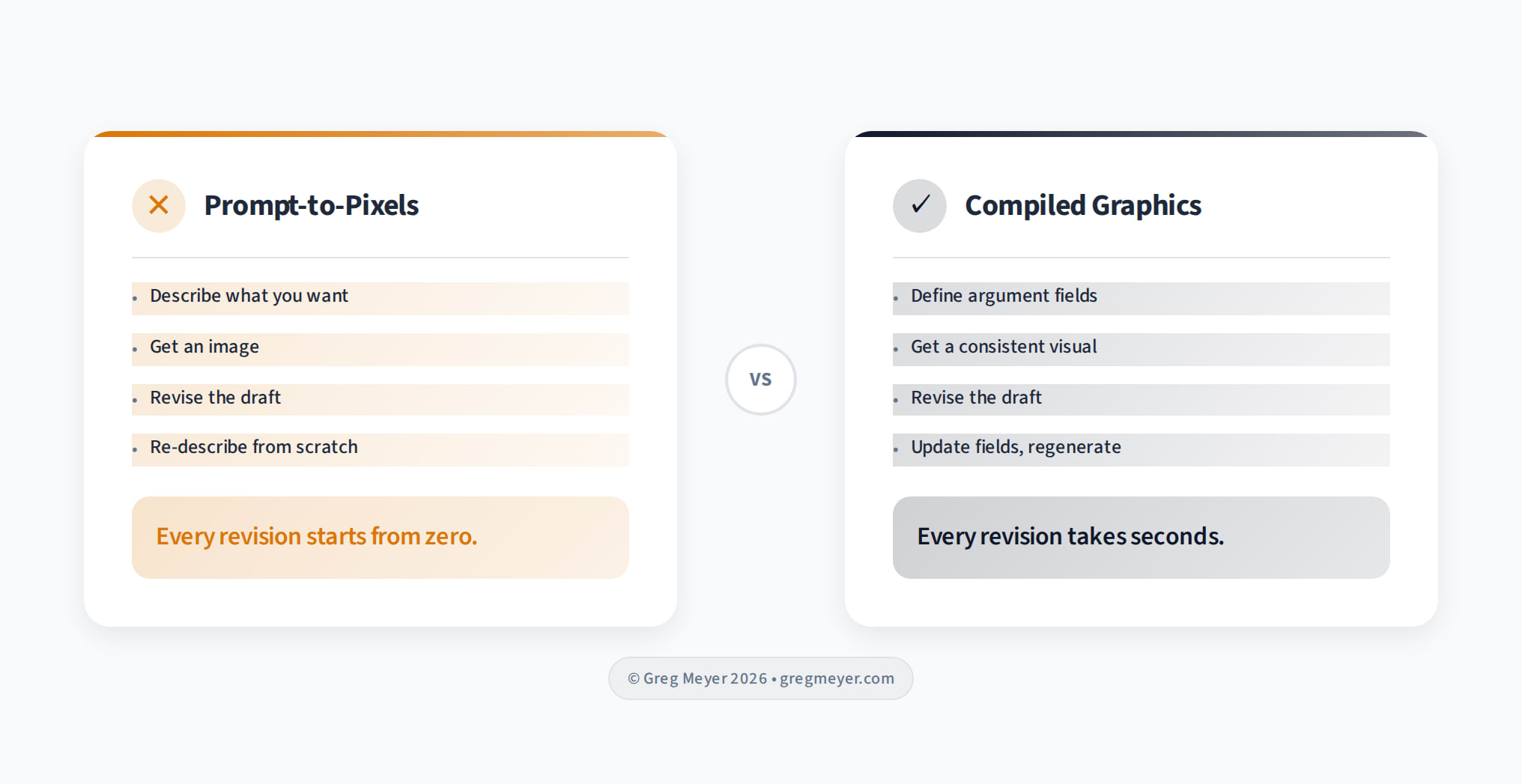 The problem is that writing is iterative and publishing is unforgiving. You need graphics that hold their structure while your message changes. With prompt-to-pixels generation — the “make me an image of this” approach — the result drifts every time. Fonts shift. Spacing varies. Comparisons stop lining up.