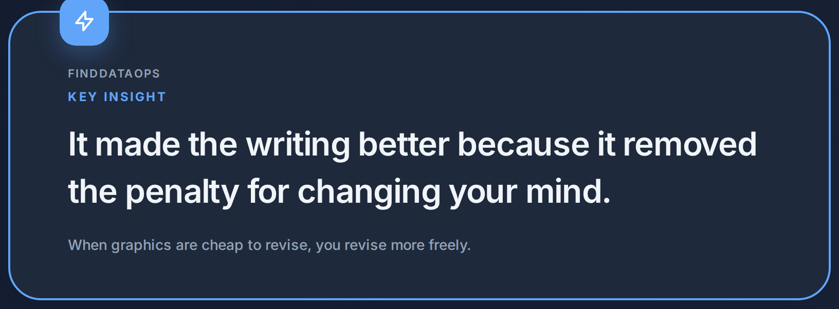 When graphics are cheap to produce, you produce more of them. When they are cheap to revise, you revise the writing more freely because you know the visuals will follow. The tool did not just save time on graphics. It made the writing better because it removed the penalty for changing your mind.