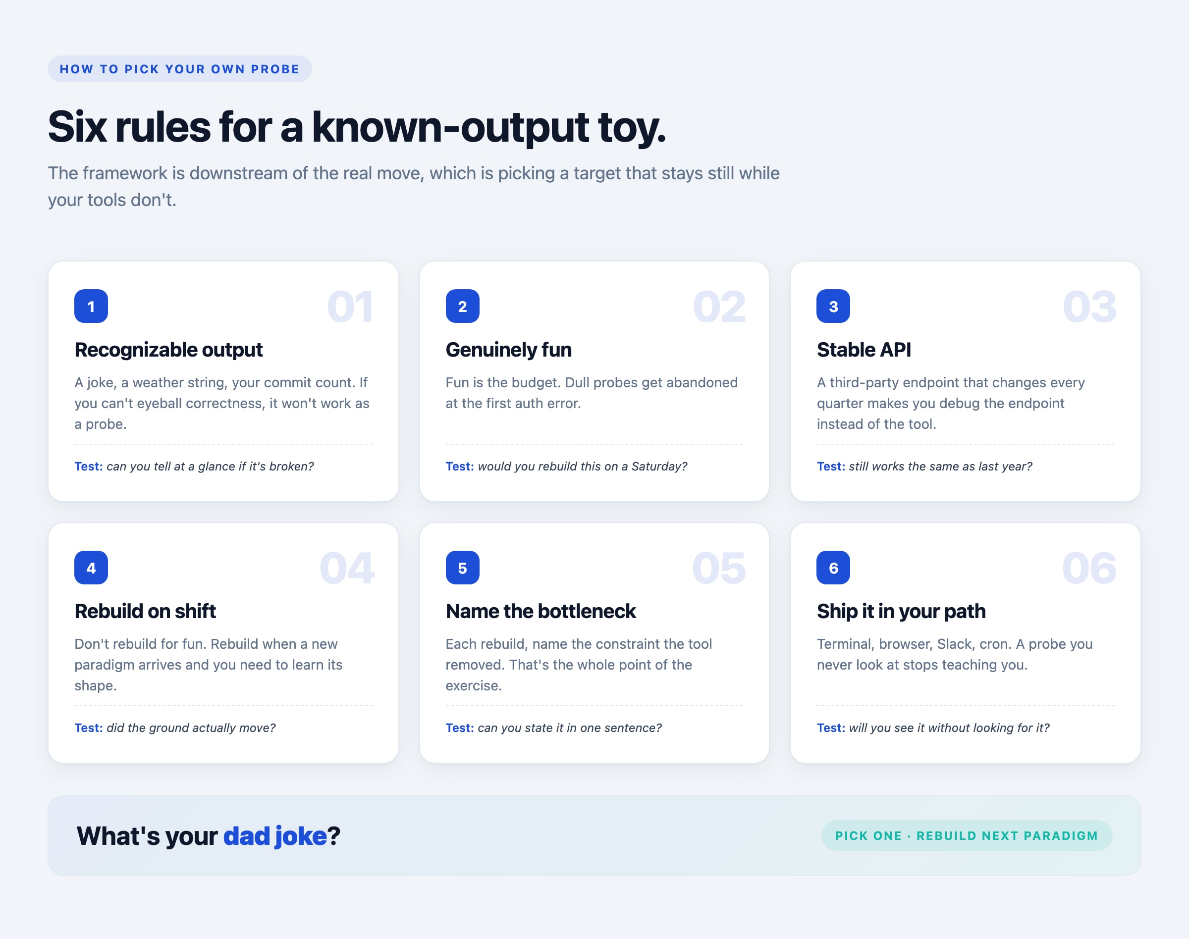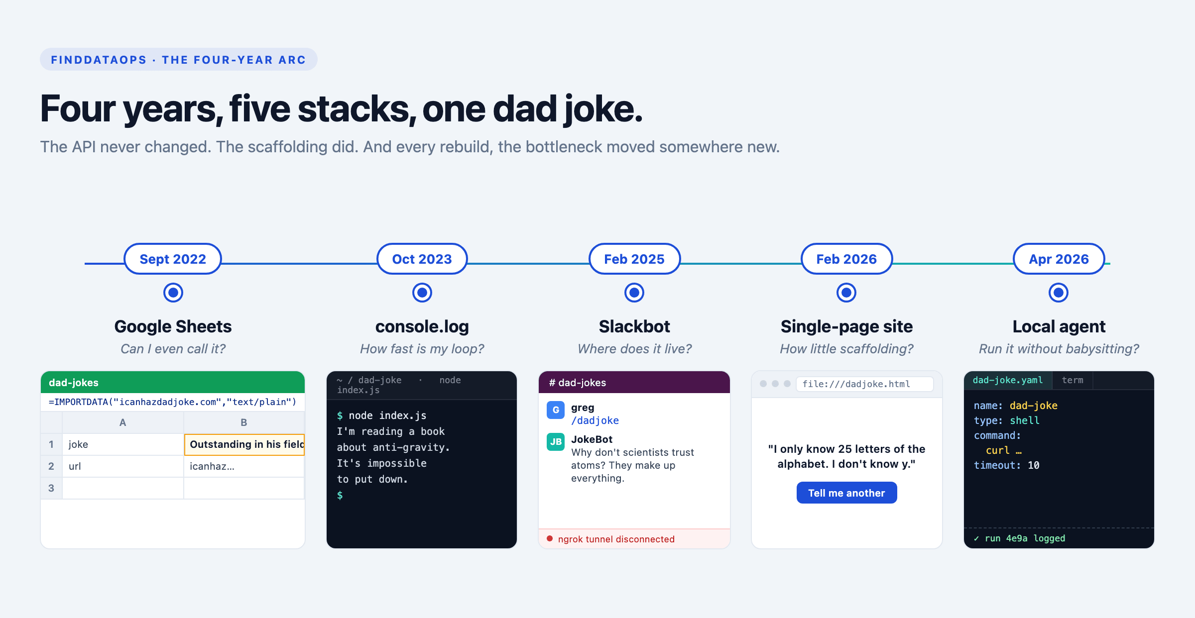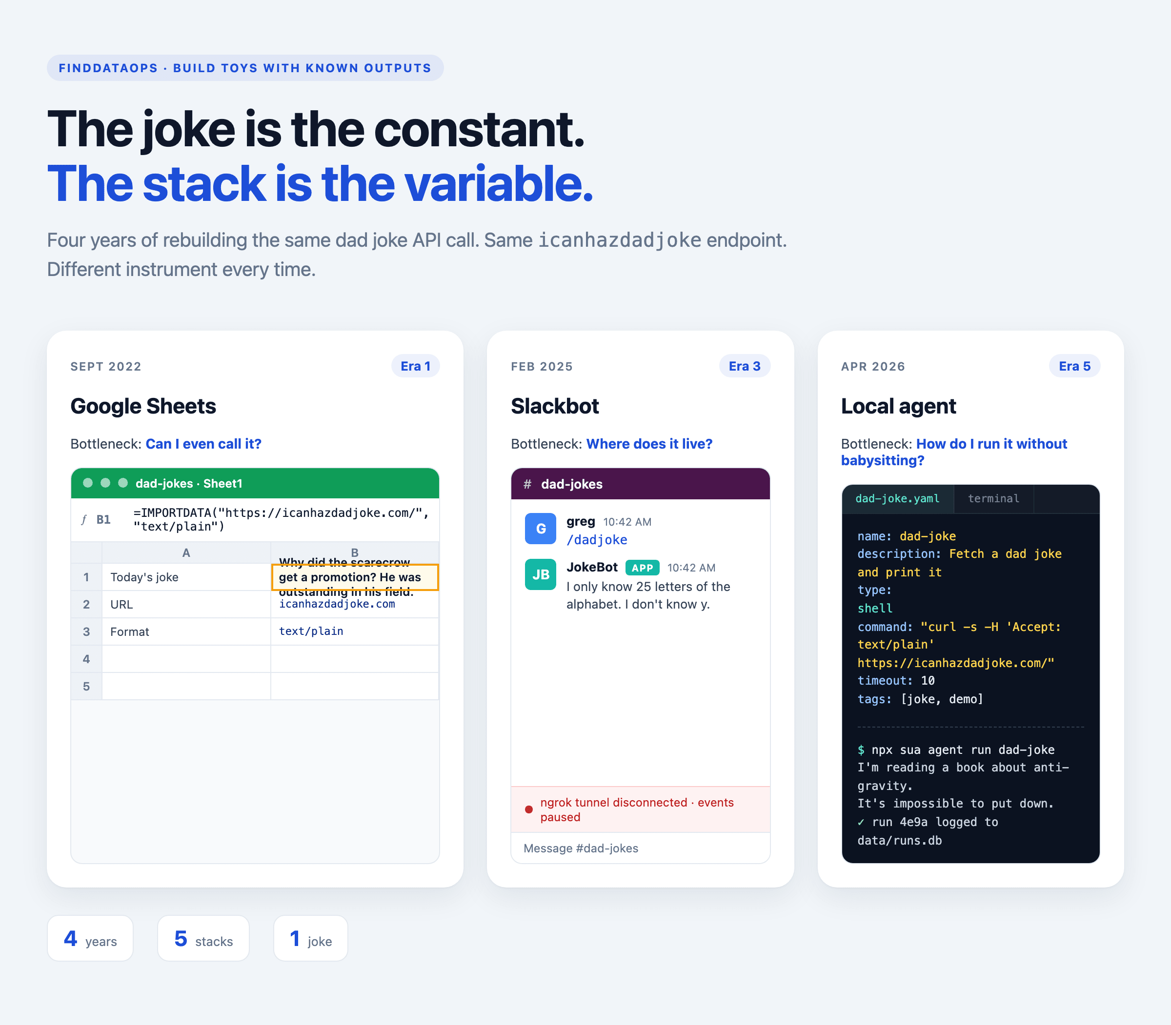 This started by accident. In 2022 I wanted to see if Google Sheets could pull data from a URL, and “a dad joke” was the simplest thing I could think of to fetch. I’ve been repeating the experiment ever since. Five stacks later, I’ve realized the joke isn’t the project. The joke is the instrument I measure the project with.