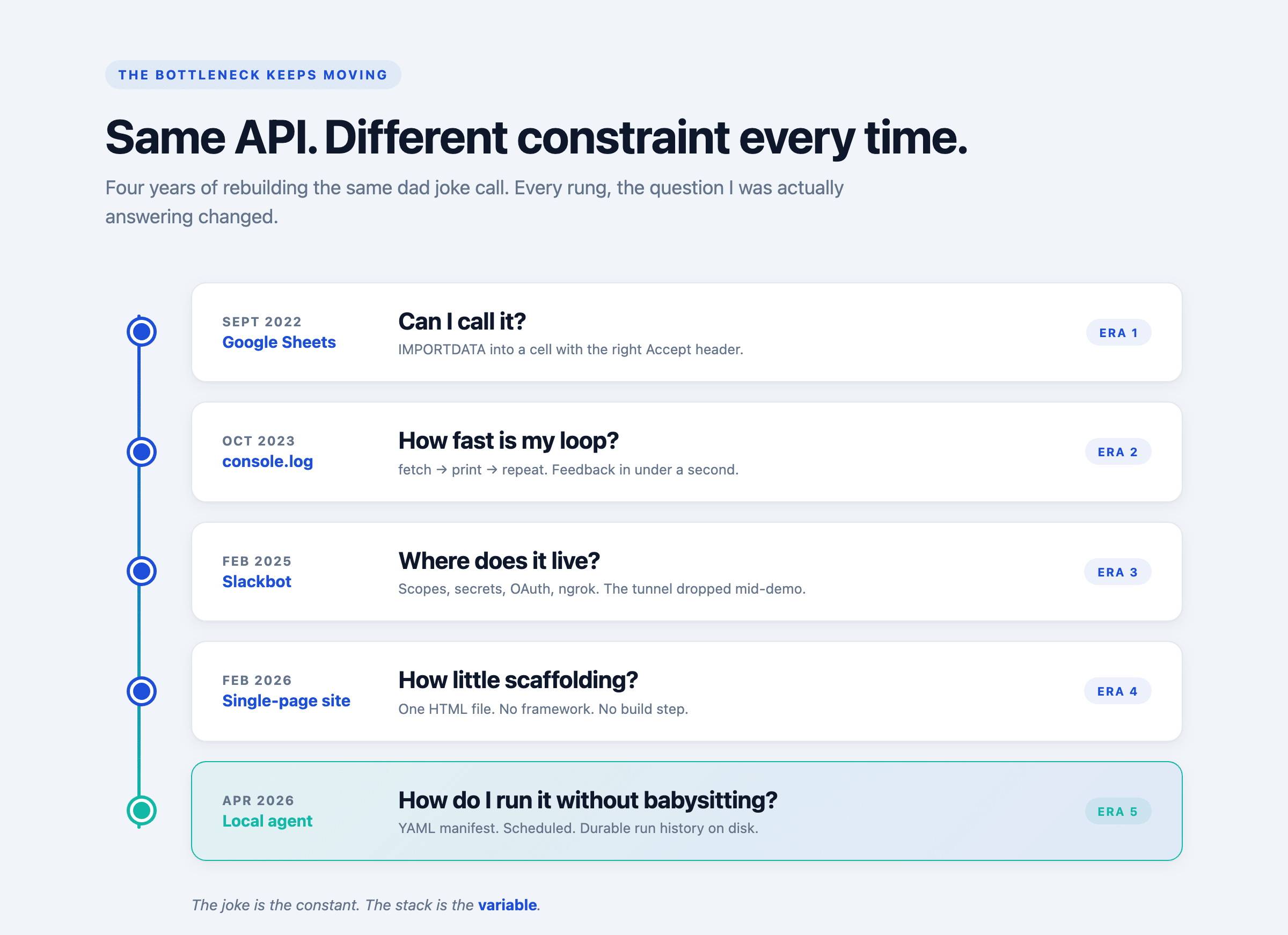 Not constantly. Every eighteen months or so, when some new tool or paradigm catches my eye, I sit down and rebuild the same little thing I built the last time. The API is always icanhazdadjoke. The output is always a groaner. What changes is the scaffolding around it — and, more honestly, what changes is me.